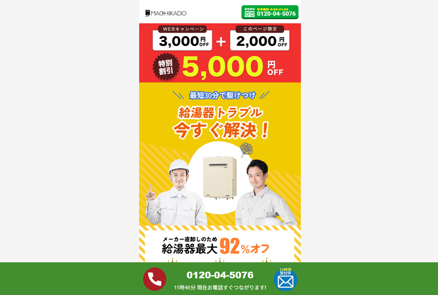 トラベルブック株式会社が運営する街角給湯相談所は、年中無休の給湯器交換業者です。「当日からお湯が出る」と記載があるように、スピーディーな対応を強みとしています。メーカーからの直接仕入れにより低価格を実現しており、給湯器本体価格が最大92%となっています。