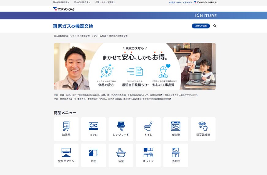 東京ガスは、国内最大手のガス事業者で、関東の一部エリアにて給湯器交換サービスを提供しています。