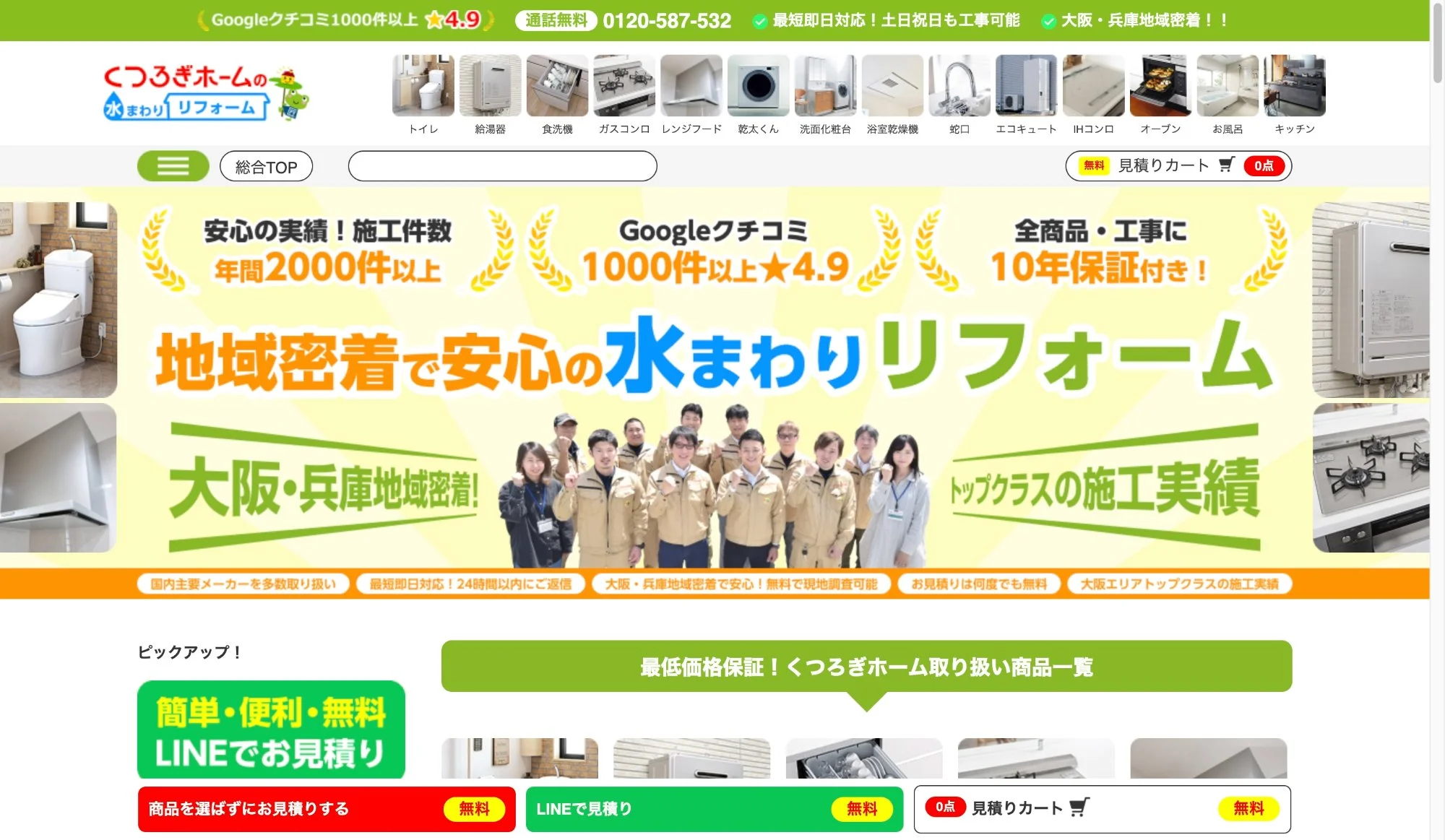 年中無休で電話・LINE・メールによる見積もり相談を受け付けており、施工担当者が直接現地で見積もりを実施します。最短即日での工事対応も可能です。