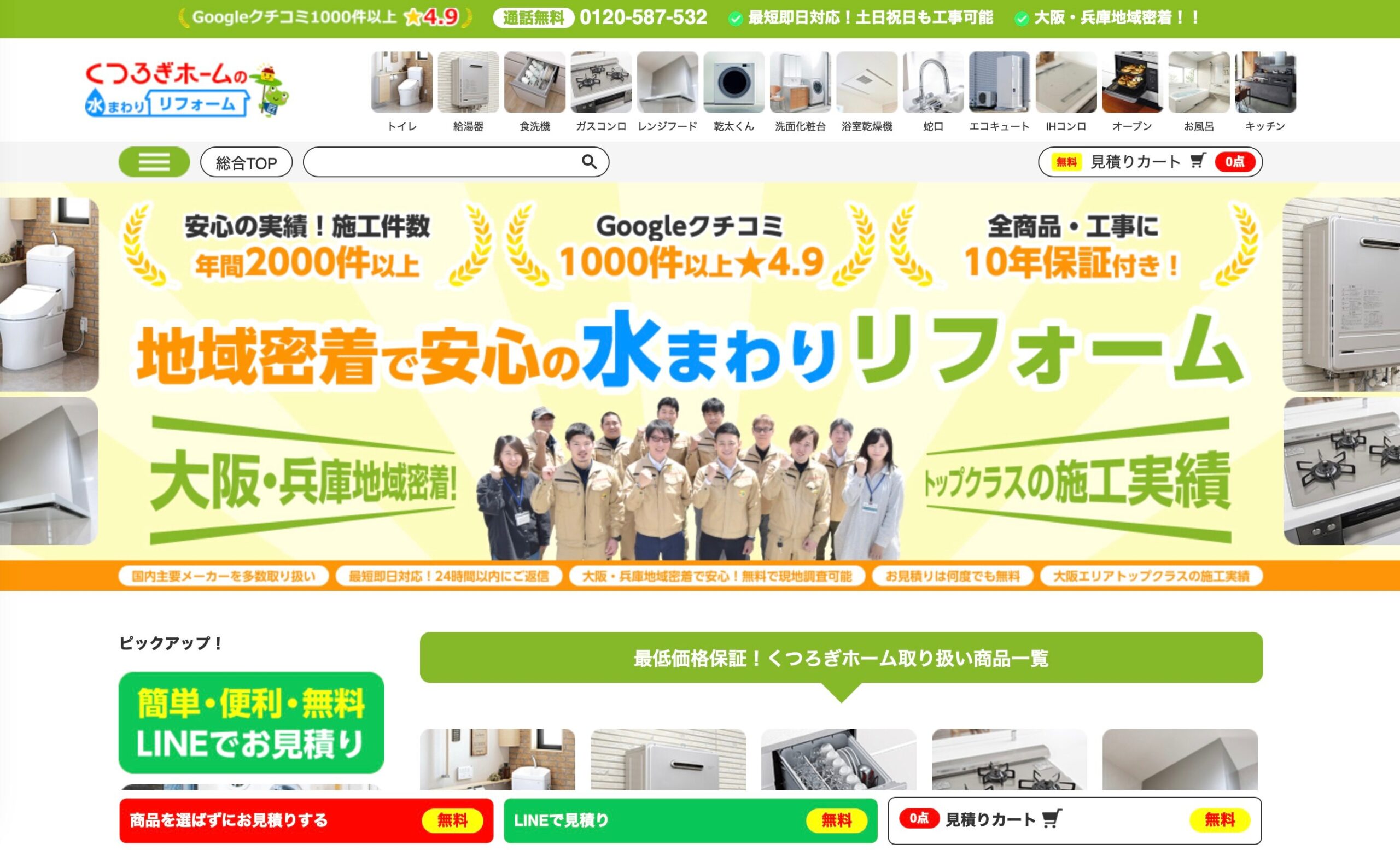 年中無休で電話・LINE・メールによる見積もり相談を受け付けており、施工担当者が直接現地で見積もりを実施します。最短即日での工事対応も可能です。
